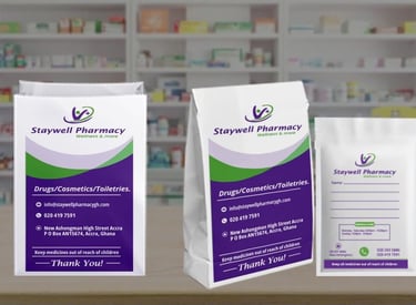 We are manufacturers of eco-friendly pharmacy paper bags based in Madina Estate, Accra. As a trusted destination for sustainable packaging, we supply pharmacies, hospitals, food vendors, and event organizers nationwide—with delivery or convenient pickup options. Our factory operates 24/7, offering over 20 different pouch and bag sizes, from single-strip issues to monthly supplies. We proudly serve customers across Ghana and also export. Contact us today for green packaging you can rely on